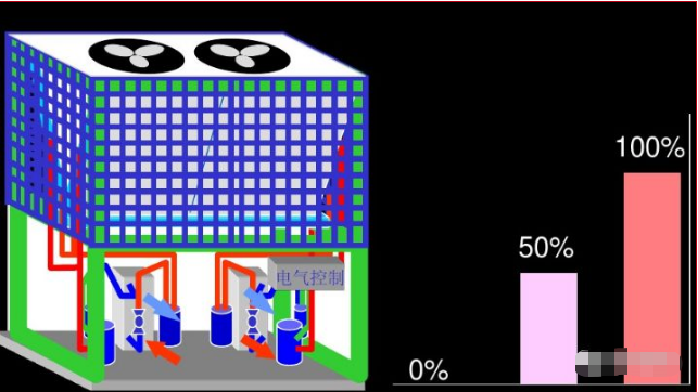 VRV空调系统全称即变制冷剂流量系统,系统结构上类似于分体式空调机组,采用一台室外机对应一组室内机,控制技术上采用变频控制方式,按室内机开启的数量控制室外机内的涡旋式压缩机转速,进行制冷剂流量的控制。