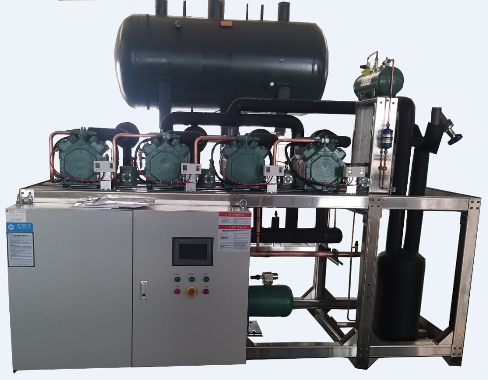 同一套机组可以由同一型号的压缩机组成,也可以由不同型号的压缩机组成。可以由同种型式的压缩机(如活塞机)组成,也可以由不同型式的压缩机(如活塞机+螺杆机)组成;既可以负载一个单一的蒸发温度,也可以负载数个不同的蒸发温度;既可以是单级系统,又可以是双级系统;既可以是单循环系统,又可以是复叠式系统等,常见的多为同类压缩机单循环并联系统。对中小型冷库来说,涡旋机的太小,螺杆机并联的太贵,用活塞的算式比较适中的,性价比最高。并联机组有哪些优势? 1)并联机组的一个最明显的优点是可靠性高,当机组中的某台压缩机出现故障时,其它压缩机仍可继续正常工作。单机机组如果出现故障,哪怕是一个小小的压力保护,也会保护停机了,冷库处于瘫痪状态,对库内存放货物的质量造成威胁,只有等待维修,别无他法可循。 2)并联机组的另一个明显优点是效率高,运行费用低。众所周知,制冷系统是按最恶劣工况选配压缩机的,而实际上制冷系统绝大部分时间运行在半负荷工况,在这种工况下并联机组COP值可以与满负荷状态时完全时同,而单机组在这时的COP值将降低一半以上,综合比较,并联机组比单机机组要节电30~50%。 3)高效节能,可分级进行容量控制,通过多台压缩机的组合,可提供多级能量调节级数,机组冷量输出可以与实际负荷需求相匹配。多台压缩机可大小不等,以更加平滑地动态匹配实际负荷由此可实现针对负荷变化的最佳能量调节,提高效率,节省能源。4)并联机组保护更全面,通常会出厂标配包括缺相、反相序、过电压、欠电压、油压、高压、低压、电子式低液位、电子式电机过载在内的全套安全保护模块。5)提供多吸气支路控制,根据需要,一台机组可供多个蒸发温度,有效利用各 蒸发温度的冷量,使系统运行在最节能工况。