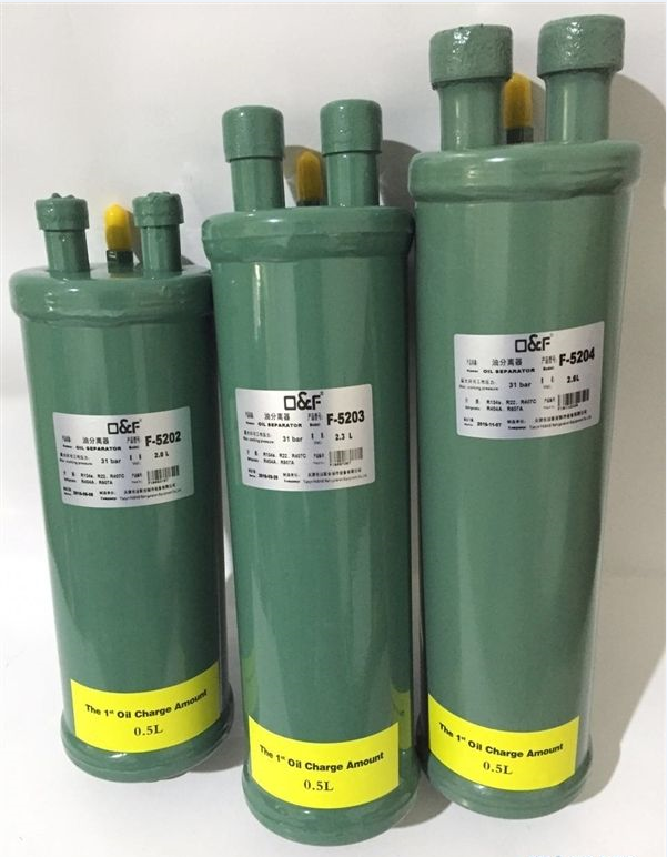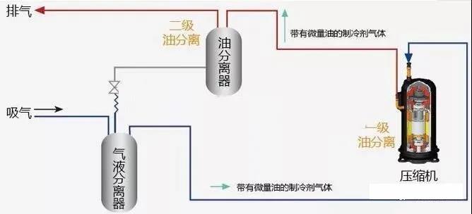 油分离器的基本工作原理主要就是利用润滑油和制冷剂蒸气的密度不同;以及通道截面突然扩大,气流速度骤降(油分离器的筒径比高压排气管的管径大3~15倍,使进入油分离器后蒸气的流速从原先的10~25m/s下降至0.8~1m/s);同时改变流向,使密度较大的润滑油分离出来沉积在油分离器的底部。或利用离心力将油滴甩出去,或采用氨液洗涤,或用水进行冷却降低汽体温度,使油蒸汽凝结成油滴,或设置过滤层等措施来增强油的分离效果。