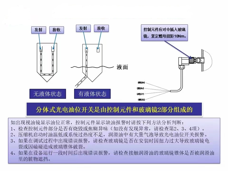 4、如果在设备运行一段时间后出现错误报警,请检查接触润滑油的玻璃镜椎体是否被润滑油里的赃物遮挡。