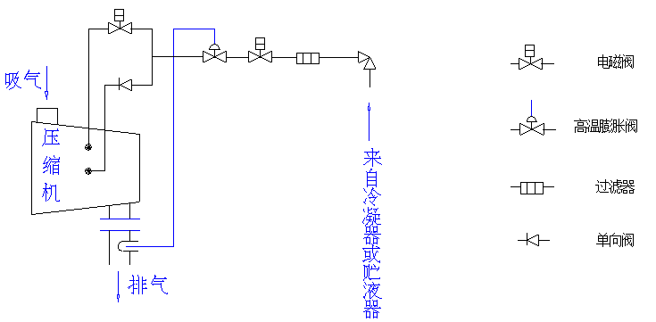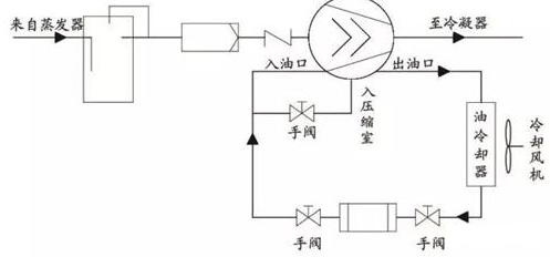 带喷液冷却的机组中,有冷凝器或贮液器引出的高压制冷剂液体,经过过滤器、节流阀或高温膨胀阀后喷入压缩机某中间孔口,起吸收压缩热并冷却油温的作用。