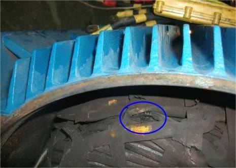 线圈与端盖机座之间爬间距离不够。特征:线圈与端盖或端盖之间,两处均有烧黑的痕迹。