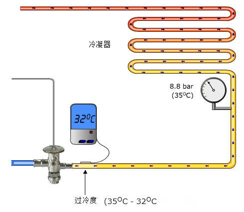 过冷度的定义:冷凝器冷凝压力对应的饱和液体温度和冷凝器出口液体实际温度的差值。