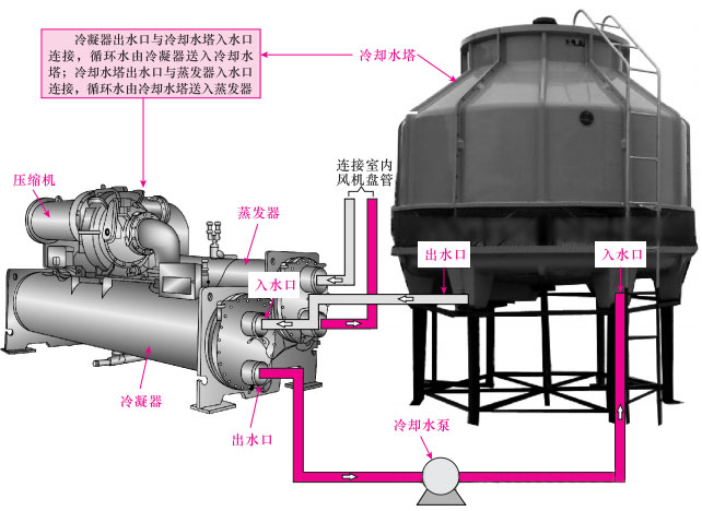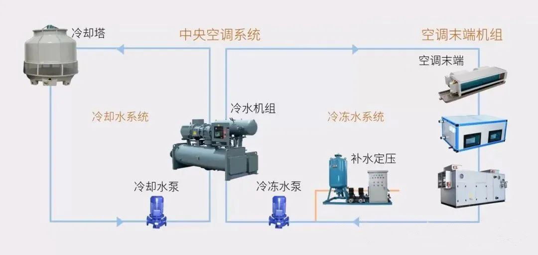 水冷冷水机组空调是以冷水机组为制冷核心的集中式空气调节系统,机组系统运行时,螺杆机组产生冷量→冷冻水泵输送7℃冷冻水至末端→回水升温至12℃返回机组;同时冷却水泵将冷凝热送至冷却塔散热。电子水处理仪持续净化水质,补水泵和膨胀水箱维持水力平衡,末端设备完成空气调节。