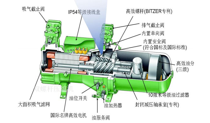 1. 螺杆机组:作为系统核心制冷设备,采用双螺杆压缩机结构,通过压缩制冷剂实现制冷循环,通过滑阀调节实现10%-100%无级冷量调节,核心优势在于低振动、运行稳定、长寿命(油路润滑系统减少磨损)和高能效等。