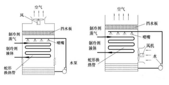 按照冷凝器使用冷却介质和冷却方式的不同,有水冷式、空气冷却式和水-空气冷却三种。