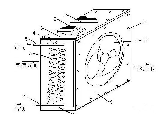 空气强制流动的空冷冷凝器:如下图所示,它由一组或几组带有肋片的蛇管组成。制冷剂蒸气从上部集管进入蛇管,其管外肋片用以强化空气侧换热,补偿空气表面传热系数过低的缺陷。在结构方面,沿空气流动方向的管排数愈多,则后面排管的传热量愈小,使换热能力不能得到充分利用。为提高换热面积的利用率,管排数以取4-6排为好。