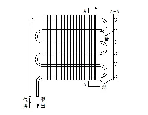(1)空气自由流动的空冷冷凝器:该冷凝器利用空气在管外流动时吸收制冷剂排放的热量后,密度发生变化引起空气的自由流动而不断地带走制冷剂蒸气的凝结热。它不需要风机,没有噪声,多用于小型制冷装置。如下图所示: