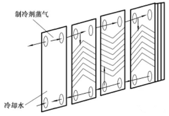 板式冷凝器:板式冷凝器是由一组不锈钢波纹板串接而成,在传热板两侧形成冷、热流体通道,在流动过程中通过板壁进行换热。