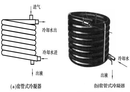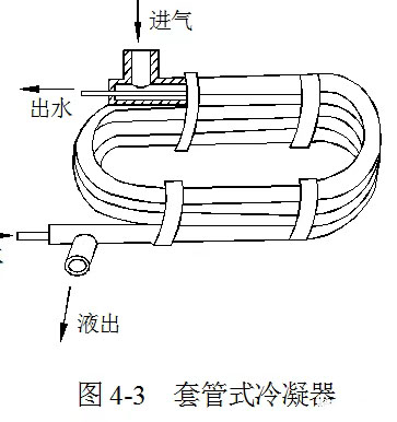 套管式冷凝器:它是由不同直径的管子套在一起,并弯制成螺旋形或蛇形的一种水冷式冷凝器。如图所示,制冷剂蒸气在套管间冷凝,冷凝液从下面引出,冷却水在直径较小的管道内自下而上流动,与制冷剂成逆流式,因此传热效果较好。