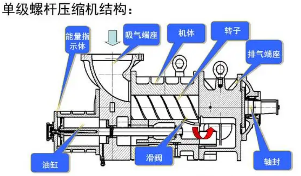 工作原理:利用一对阴阳螺杆转子的啮合运动压缩气体。阳转子带动阴转子旋转,气体被吸入转子齿槽,随转子旋转逐渐压缩,最终从排气口排出。
